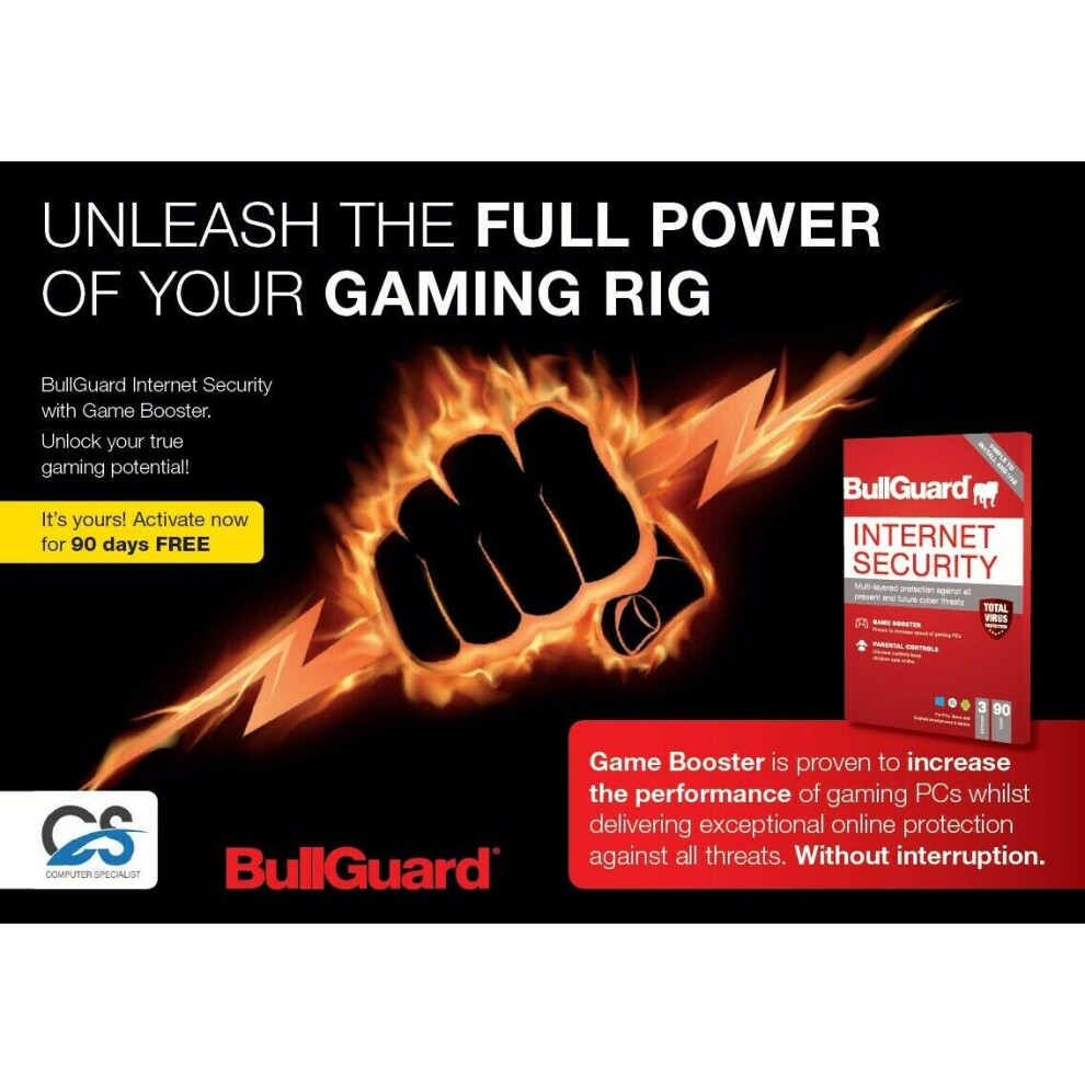 BullGuard Anti-Virus Premium internet security with Game Booster - BullGuard Internet Security delivers complete protection for your devices. BullGuard's Game Booster optimizes online games with an anti-cheat engine and even improves your video-streaming. It's the Internet Security for the gamers, and why we have installed a complimentary 90 day license on your new machine.